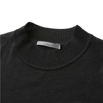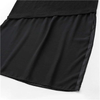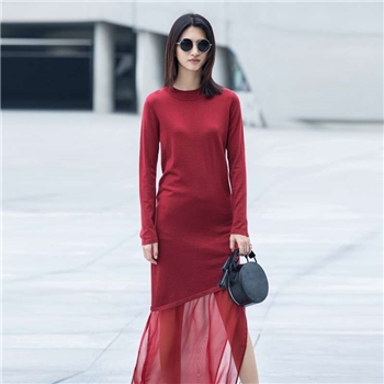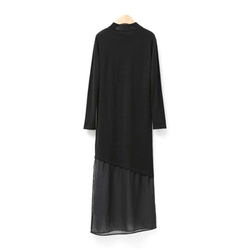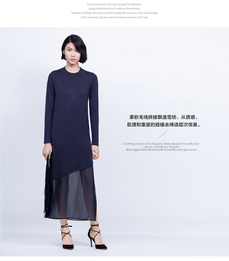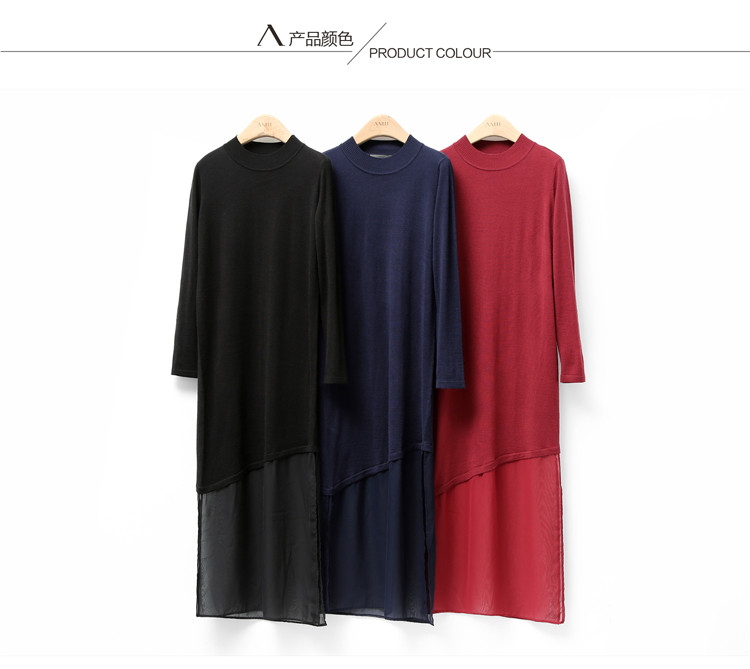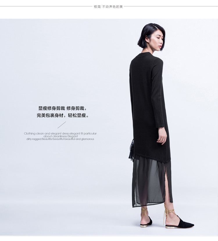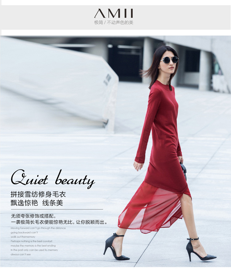AMII极简2015秋新修身拼接雪纺开衩下摆修身长袖长款毛衣